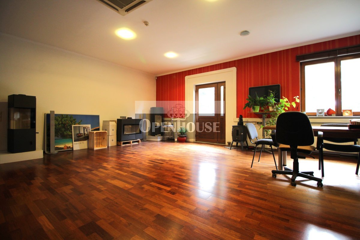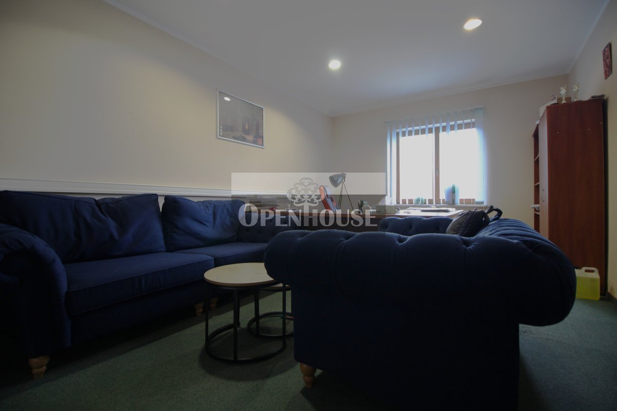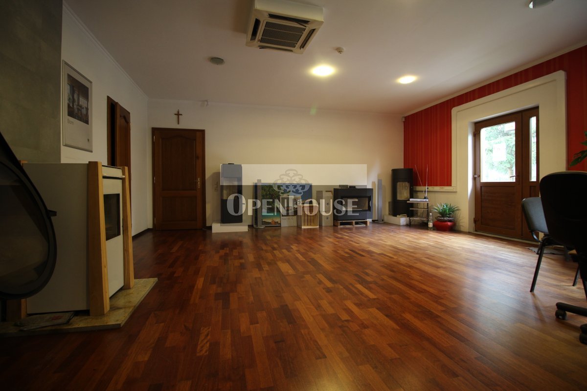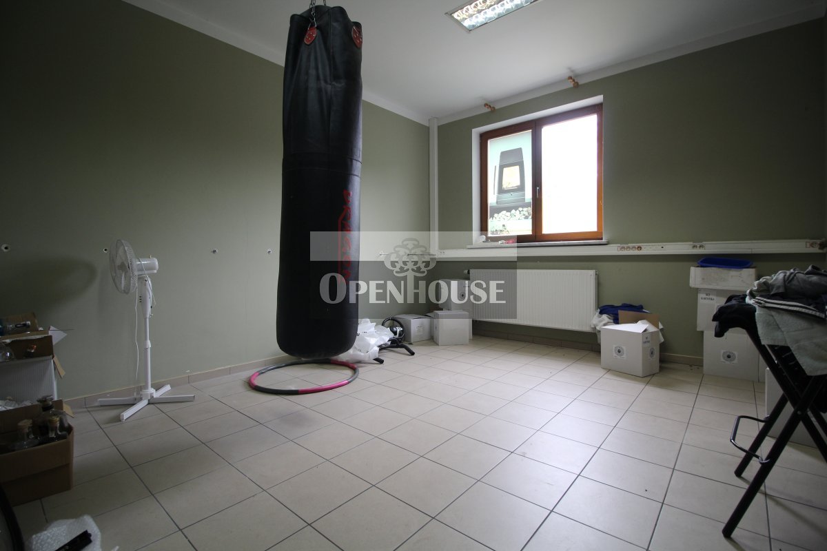 Na parterze znajduje się lokal biurowo-usługowy, trzy niezależne biura, kotłownia, warsztat, zaplecze sanitarne oraz garaż. Wnętrza wykończone są z dbałością o jakość – parapety wykonane z granitu, okna drewniane, co nadaje całości elegancki i solidny charakter.