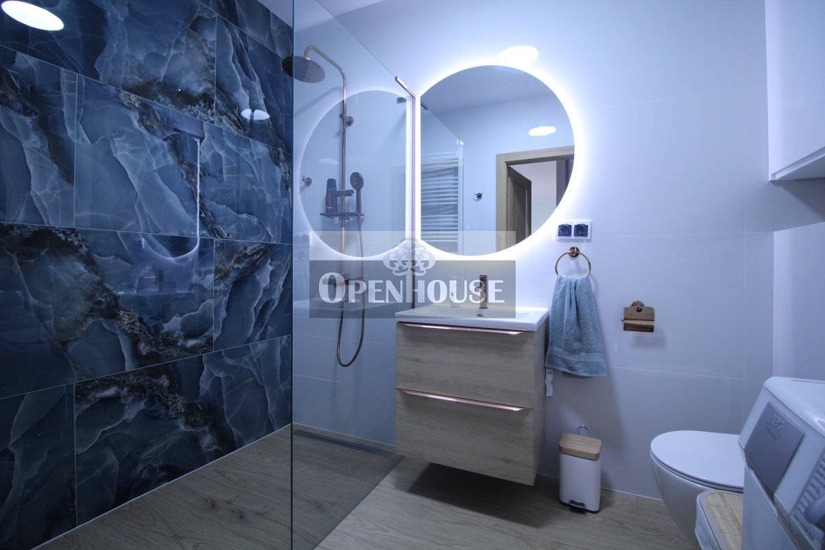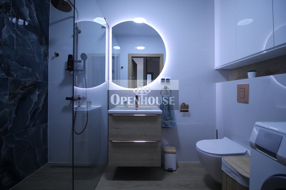 Łazienka z WC – wyposażona w kabinę prysznicową, pralkę, nowoczesną armaturę i zabudowę łazienkową.