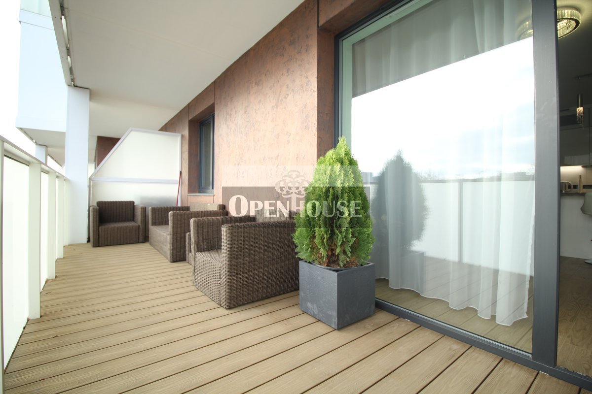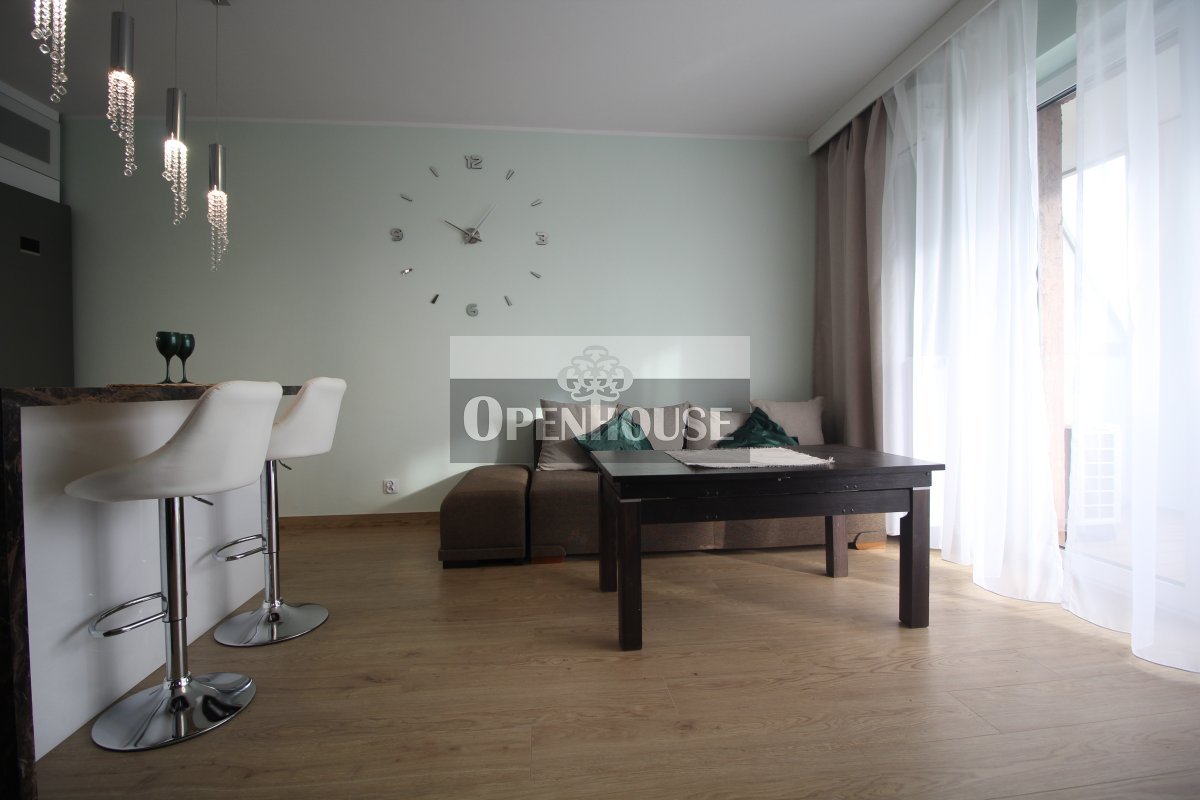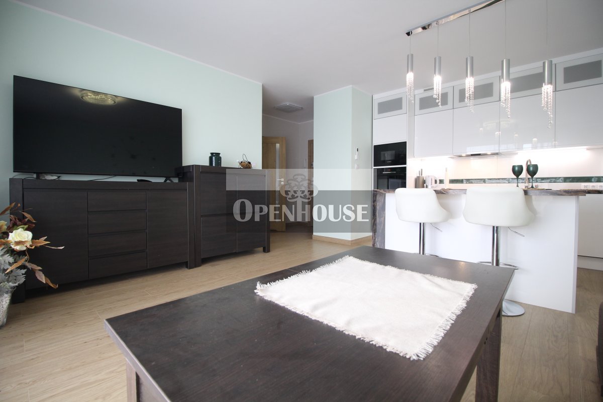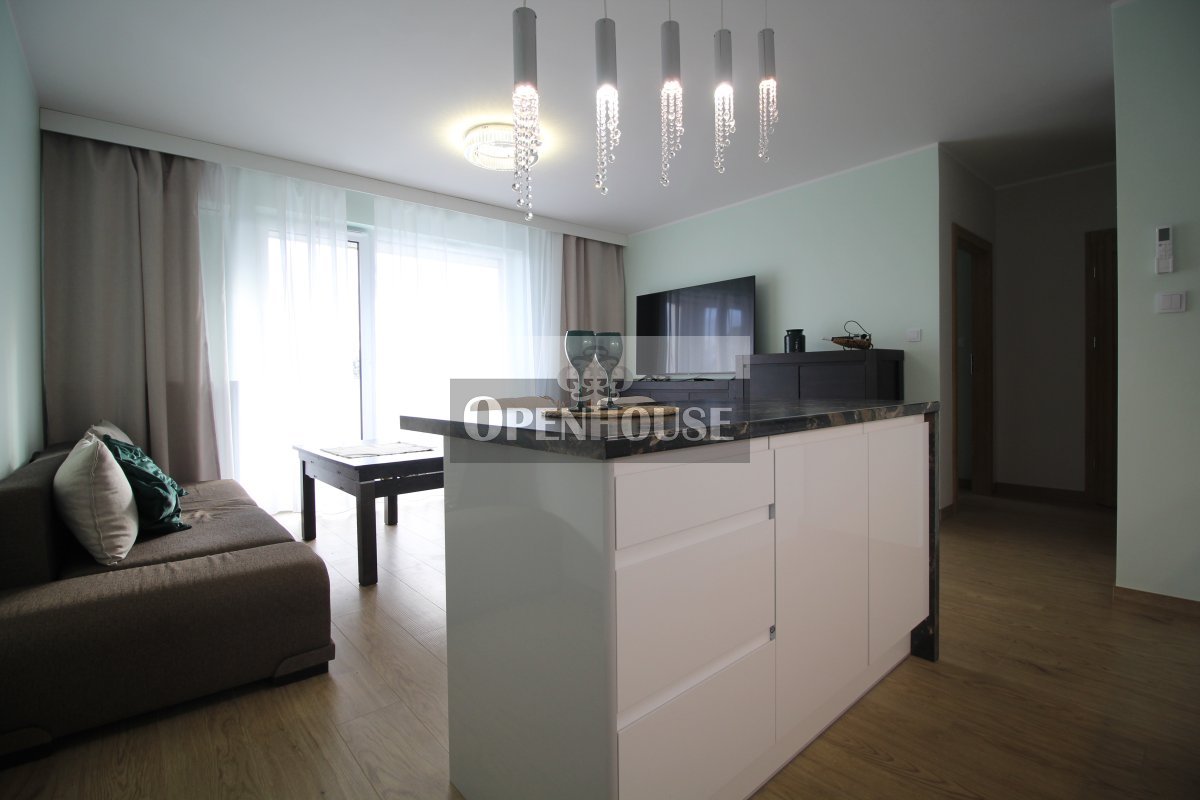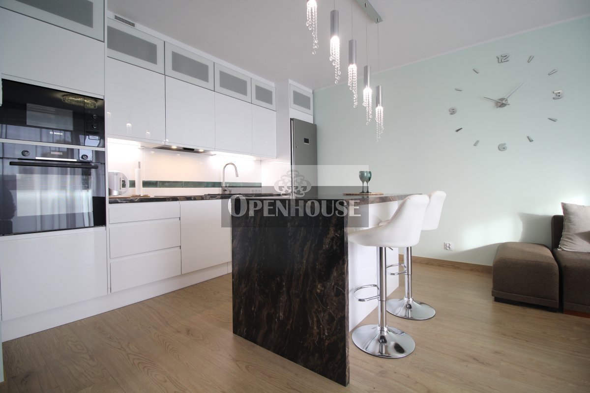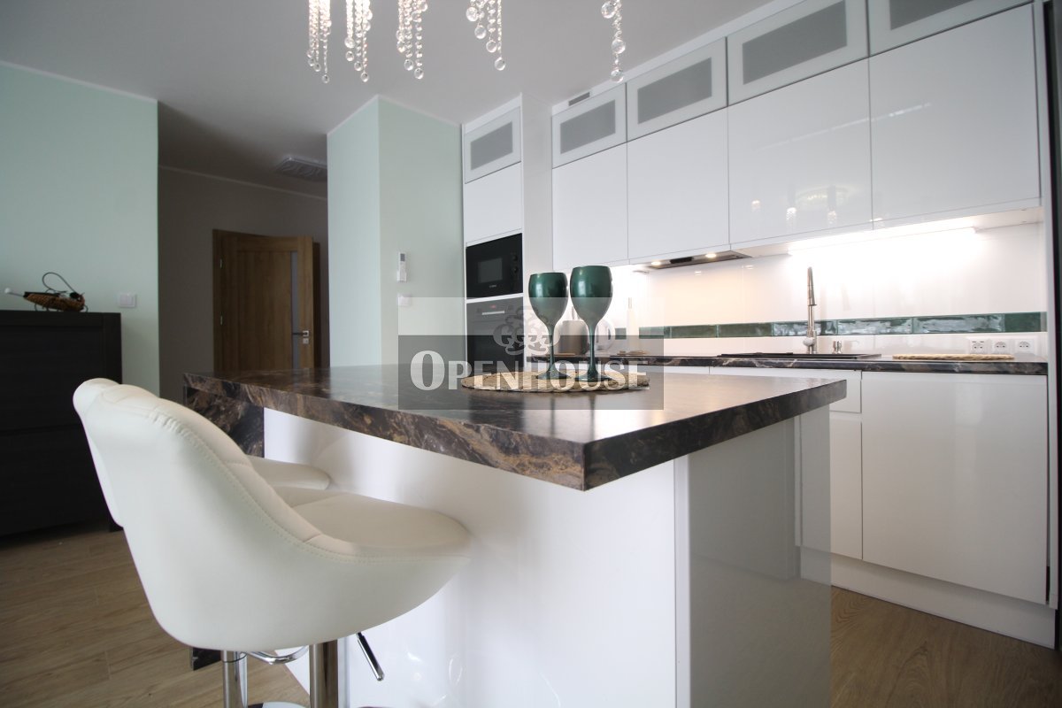 Kuchnia z salonem – w kuchni znajdują się wszystkie najpotrzebniejsze sprzęty - piekarnik, zmywarka, lodówka, mikrofalówka, okap, płyta indukcyjna, 2 hokery, czajnik elektryczny. W salonie wygodny narożnik, stolik kawowy, TV - 65 cali, meblościanka, klimatyzacja. Z salonu wyjście na balkon. Balkon o powierzchni 15m2.