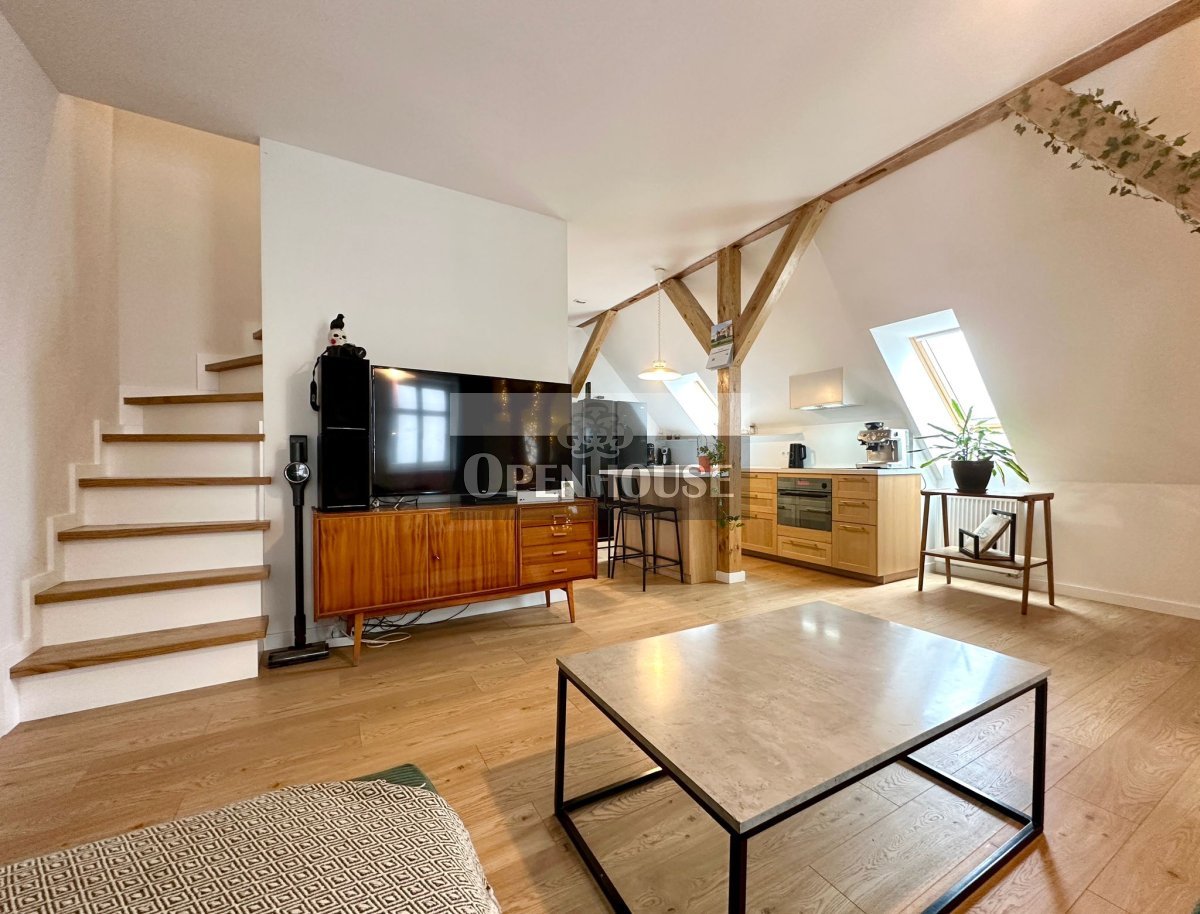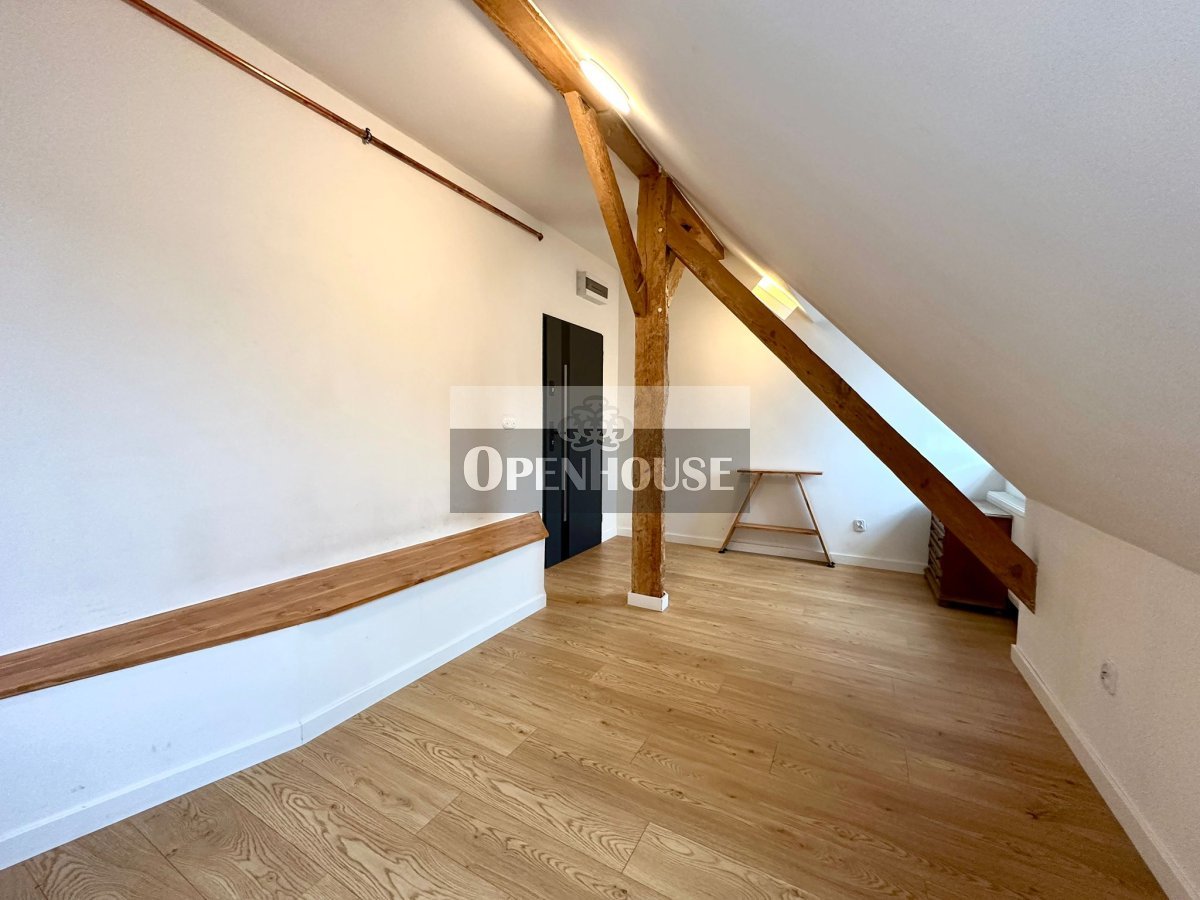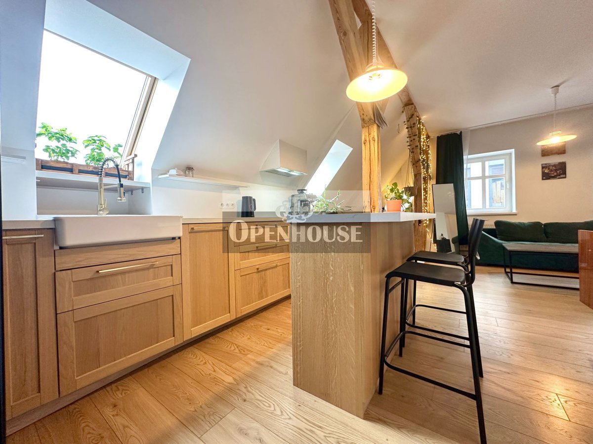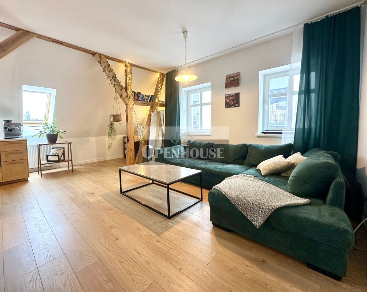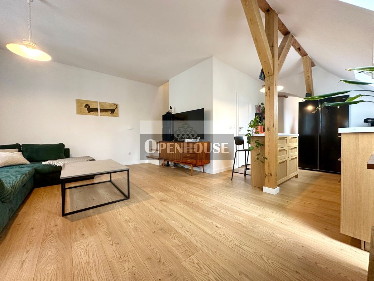 Naturalne drewniane belki, wysokie sufity, skosy i duże okna dachowe tworzą niepowtarzalny klimat wnętrza. To mieszkanie z duszą, łączy historyczną architekturę z nowoczesnym standardem wykończenia.