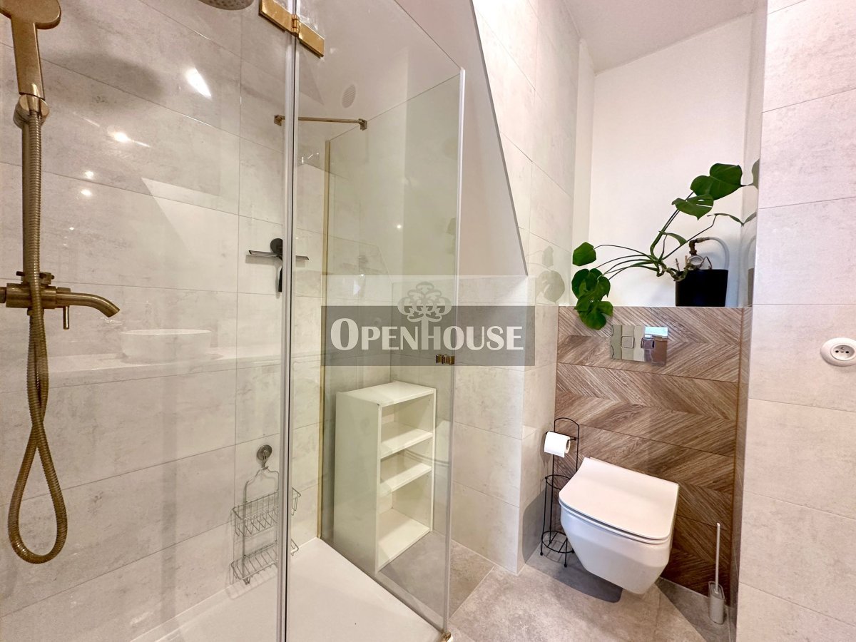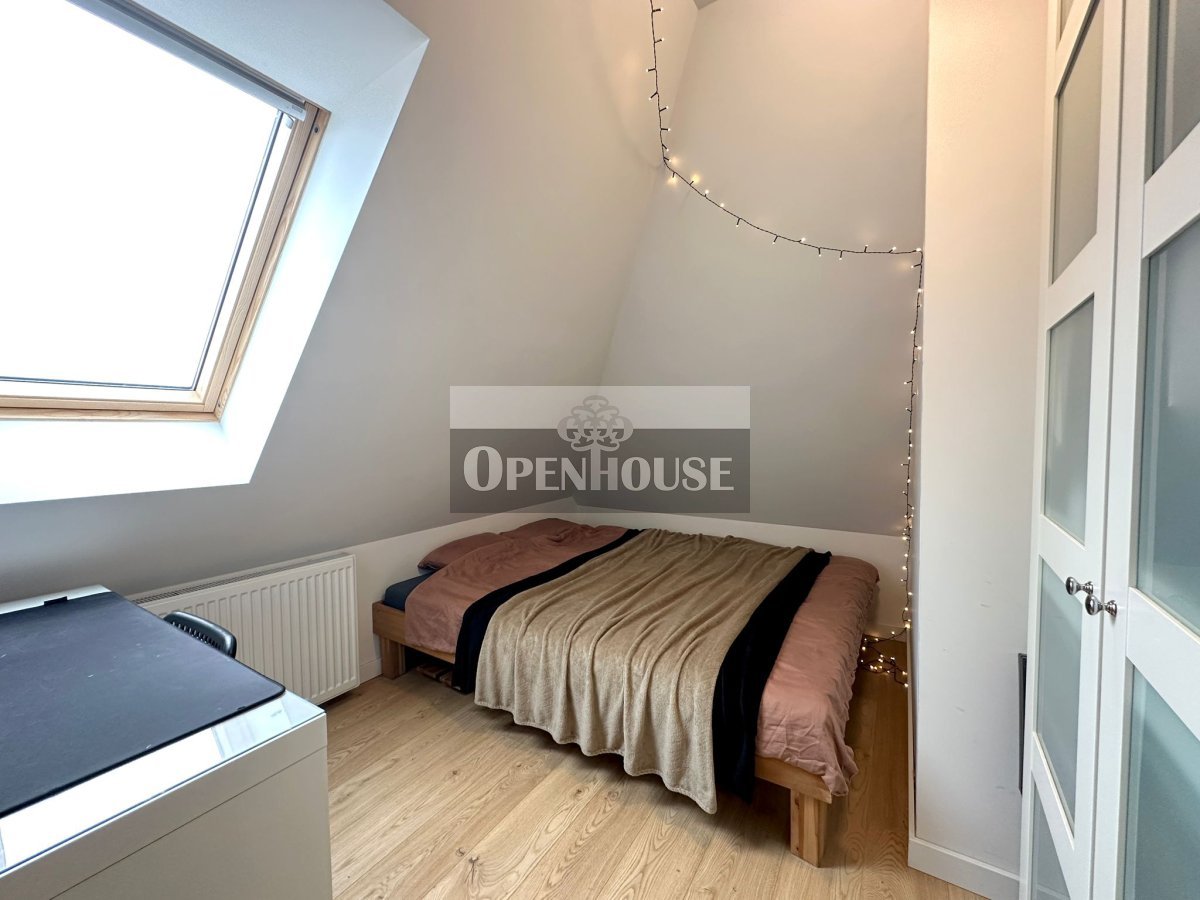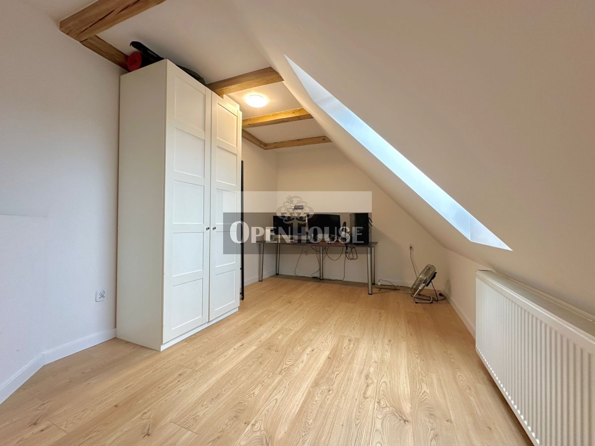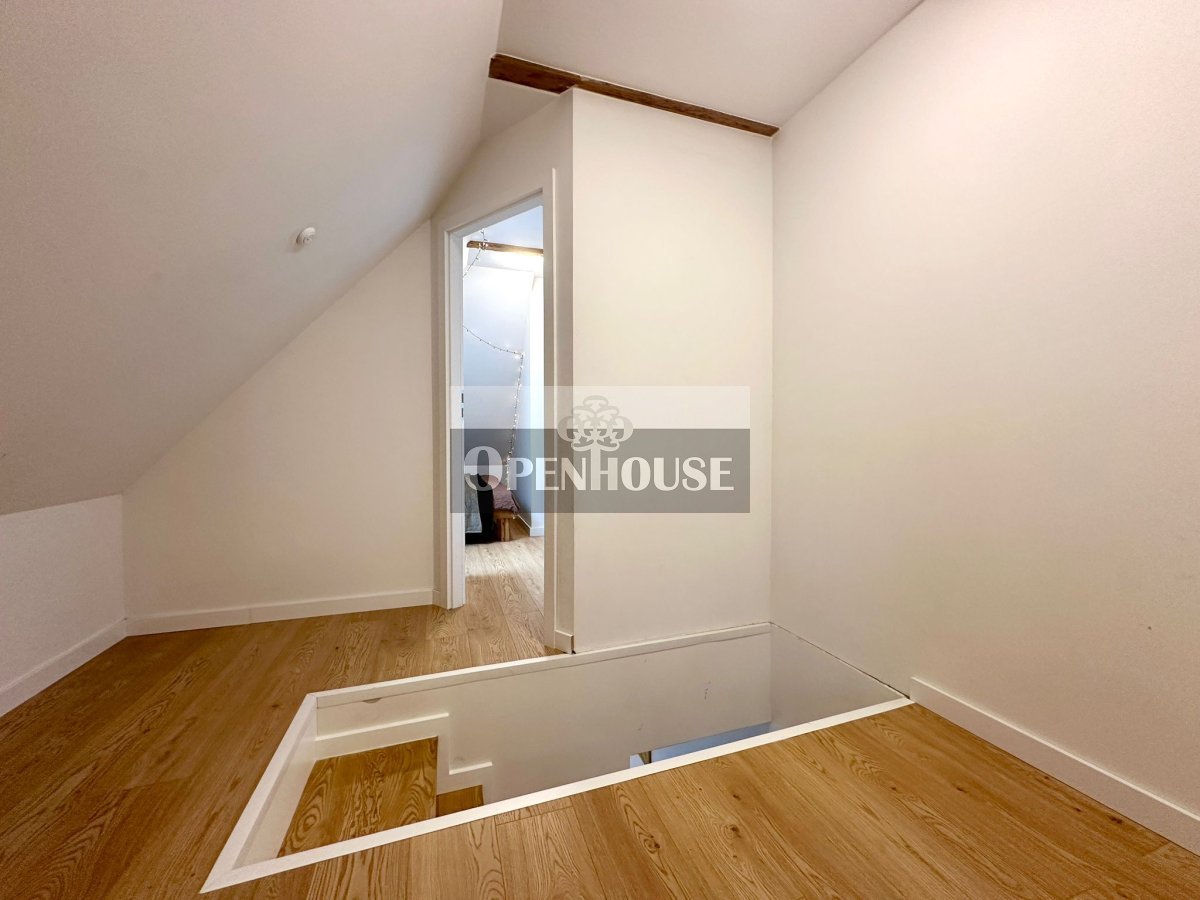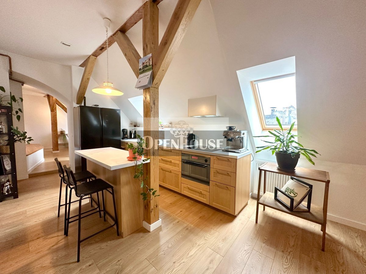 Naturalne drewniane belki, wysokie sufity, skosy i duże okna dachowe tworzą niepowtarzalny klimat wnętrza. To mieszkanie z duszą, łączy historyczną architekturę z nowoczesnym standardem wykończenia.